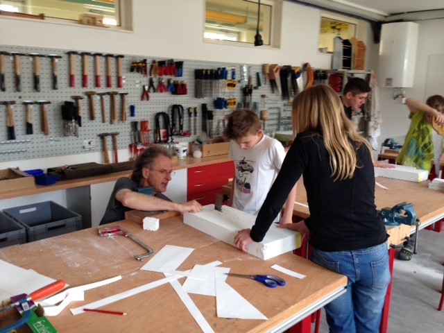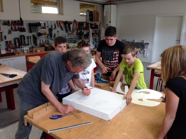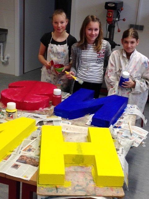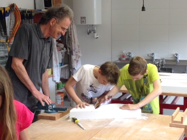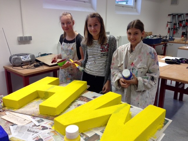 Unter seiner profunden Anleitung wurden die Buchstaben aus den Ytong- Blöcken geschnitten und in den darauffolgenden BE-Stunden bearbeitet: gespachtelt, geschliffen, grundiert, bemalt- so manches Missgeschick repariert aber das Ergebnis kann sich sehen lassen.
