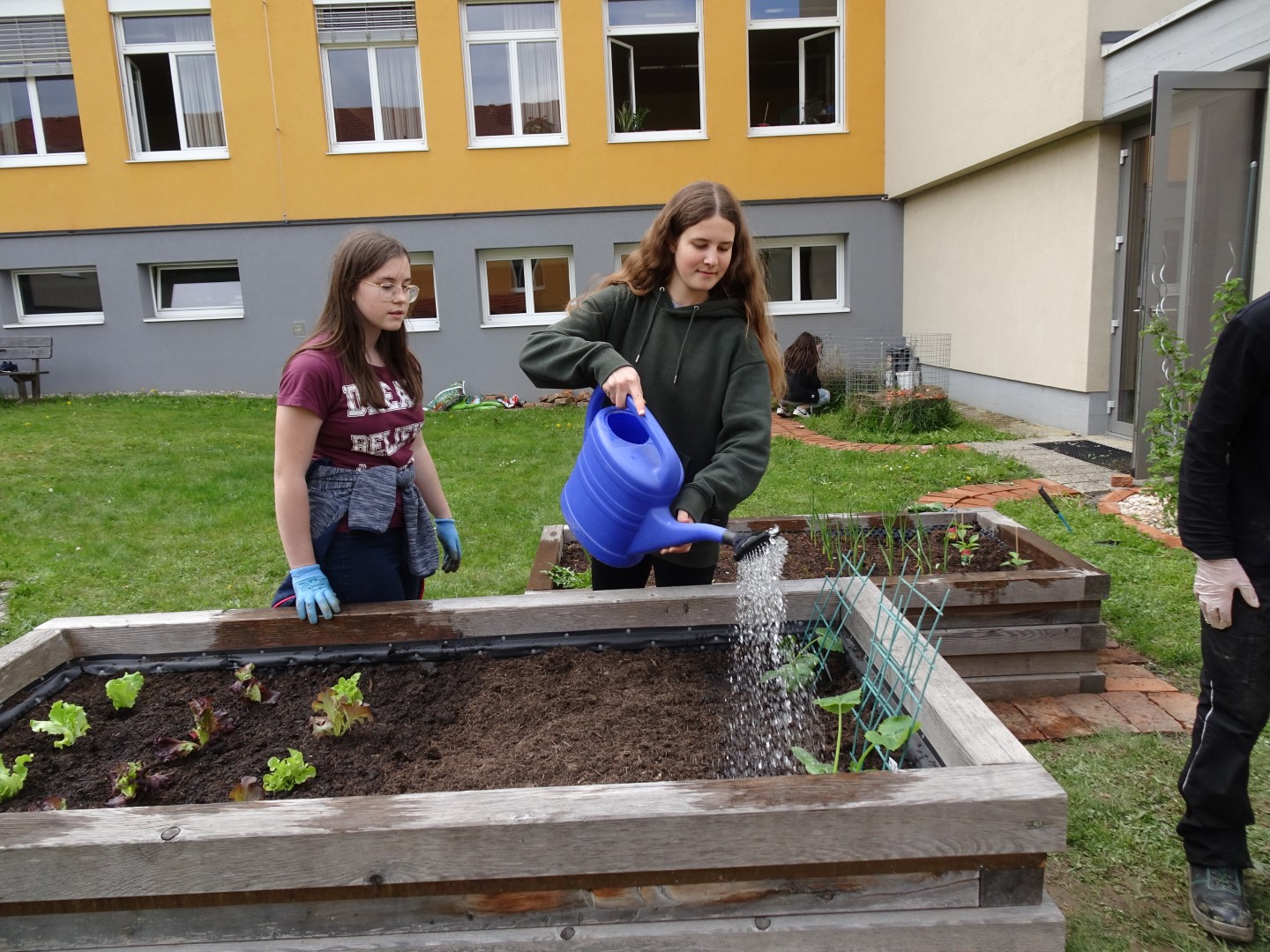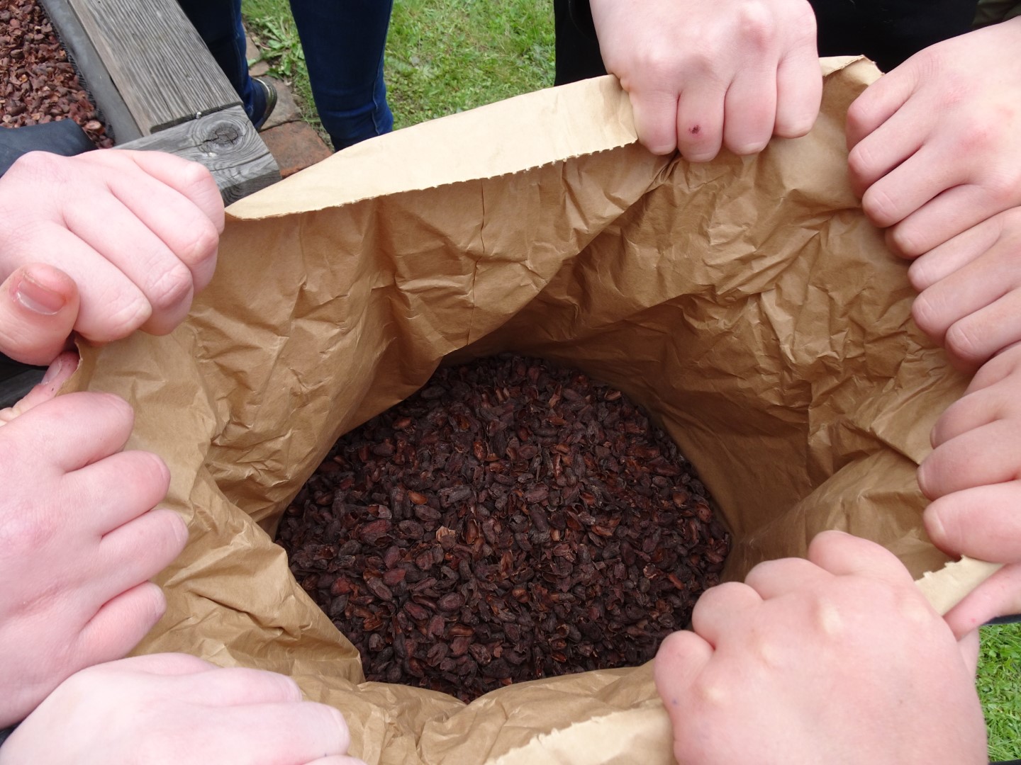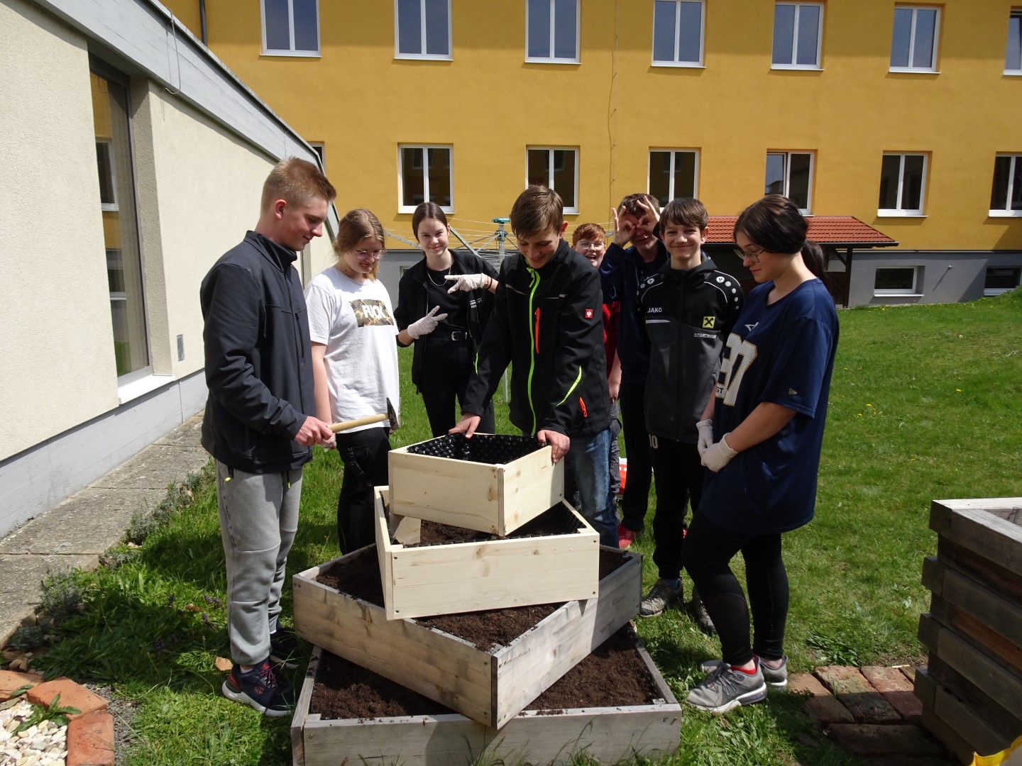 Durch die Pandemie und der Lockdowns wurde der Schulinnenhof stark vernachlässigt. Die Fit Gruppe der 4. Und 3. Klasse startete hier sehr engagiert durch und befüllte beide Hochbeete komplett neu. Das heißt, zur Gänze entleert, ein neues Wühlmausgitter und Vlies montiert und mehrere Schichten – wie es sich gehört – eingefüllt und neu bepflanzt. Ein besonderer HUMUS und ein besonderes AROMA bekommen unsere Pflanzen durch Kakaoschoten der Firma Zotter. Danke an unseren Chocolatier Josef Zotter, der unserer Anfrage um eine Unterstützung in diese Richtung – nicht das erste Mal - gerne nachgekommen ist. Es gab Schüler, die konnten nicht widerstehen und haben sprichwörtlich in Schokolade gebadet. Der Duft war auch wirklich verführerisch. ?