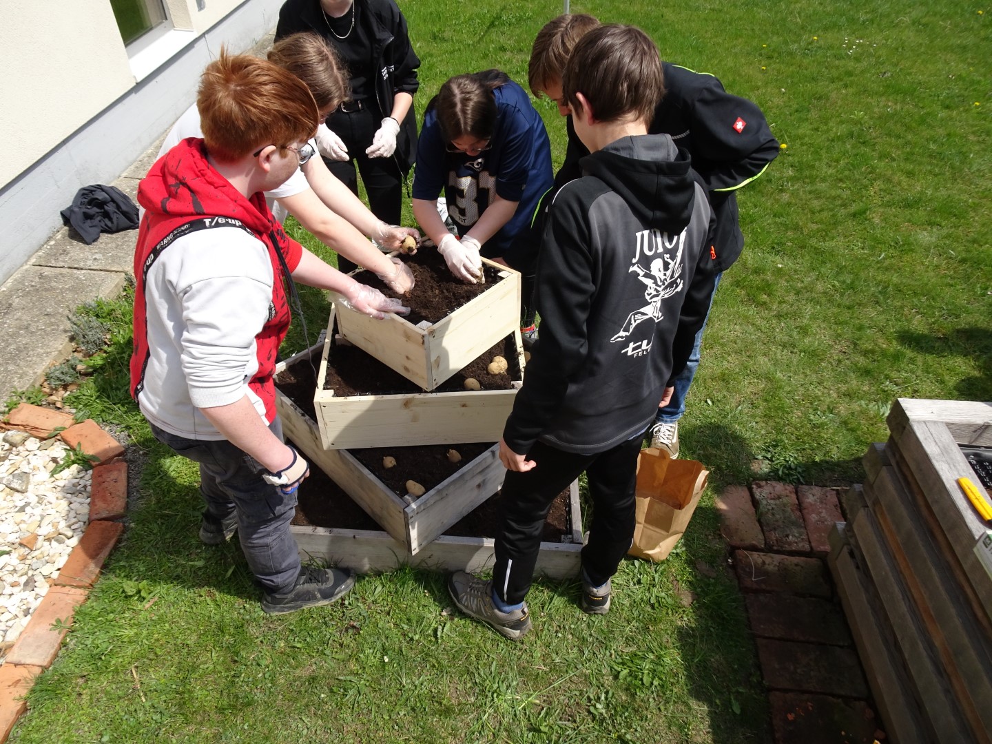 Salate, Karotten, Radieschen, Kohlrabi, Lauch, Zwiebel, Paprika und Zucchini kann man nun beim Wachsen zuschauen. ?Die Fit Gruppe der 4. Klasse wollte im Schulgarten ebenfalls einen Beitrag leisten und ihre Spuren hinterlassen. Sooooo entstand unsere Kartoffelpyramide.